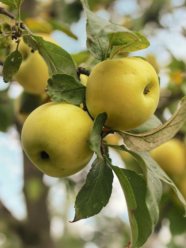 Cette pomme d’un jaune lumineux offre une chair ferme et tendre à la fois. Elle est appréciée pour son goût unique légèrement acidulé et qui rappelle subtilement la poire.