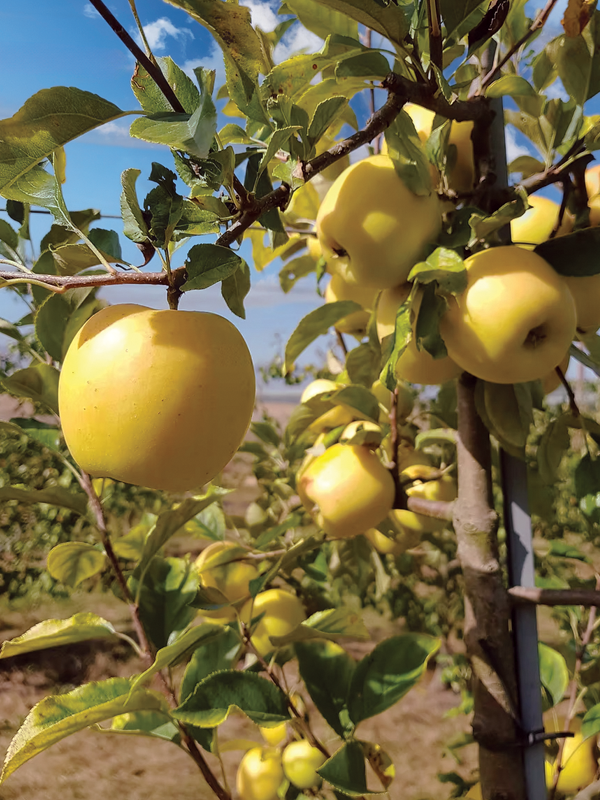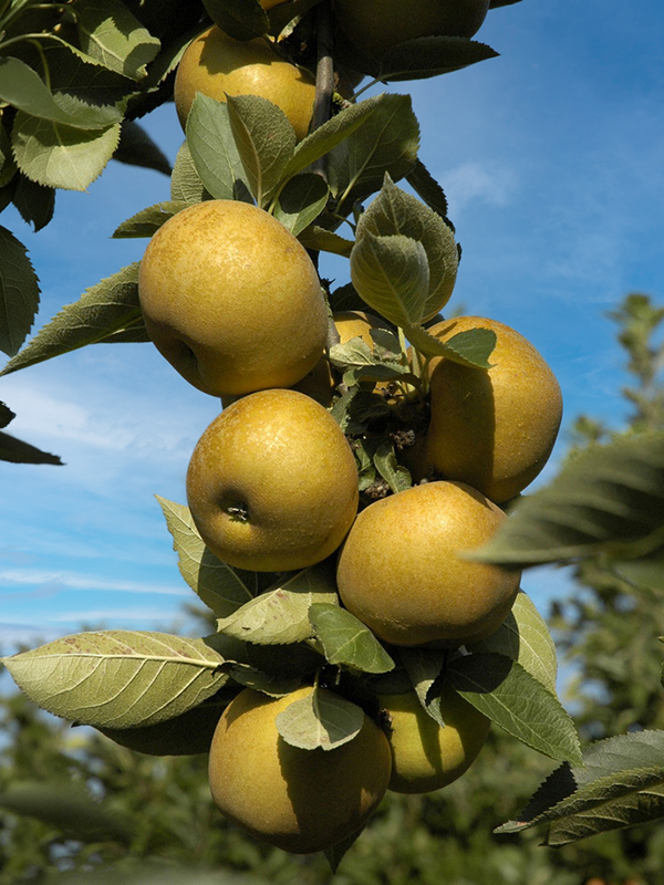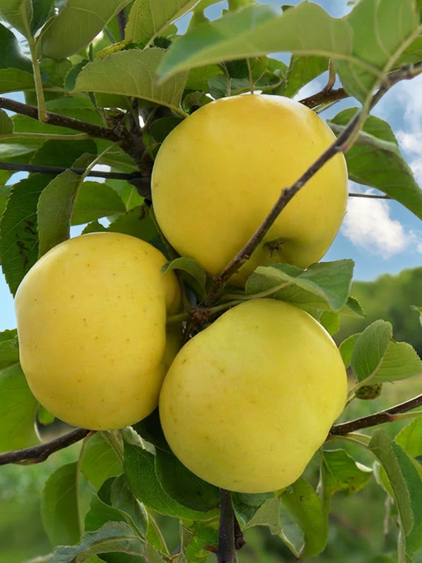 Cette belle pomme jaune propose une chair fine, croquante et juteuse.